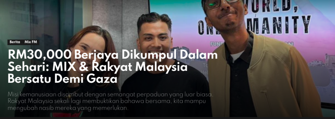 Stesen radio MIX telah melancarkan kempen “Satu Dunia, Satu Kemanusiaan,” sebuah inisiatif untuk meringankan penderitaan mangsa perang di Gaza. Dengan kerjasama organisasi bukan kerajaan (NGO) Karisma Humanitarian Outreach Mission (KHOM), inisiatif ini bertujuan menginspirasi usaha bermakna untuk membantu mereka yang memerlukan dan mengukuhkan aktivisme sosial dalam kalangan rakyat Malaysia. Bacaan artikel penuh disini.