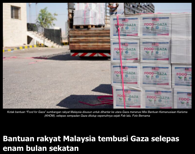 KUALA LUMPUR, 29 Julai: Sebanyak 2,400 tan bantuan kemanusiaan sumbangan rakyat Malaysia berjaya menembusi Gaza awal pagi semalam melalui pintu masuk Jambatan Raja Hussein di Jordan.